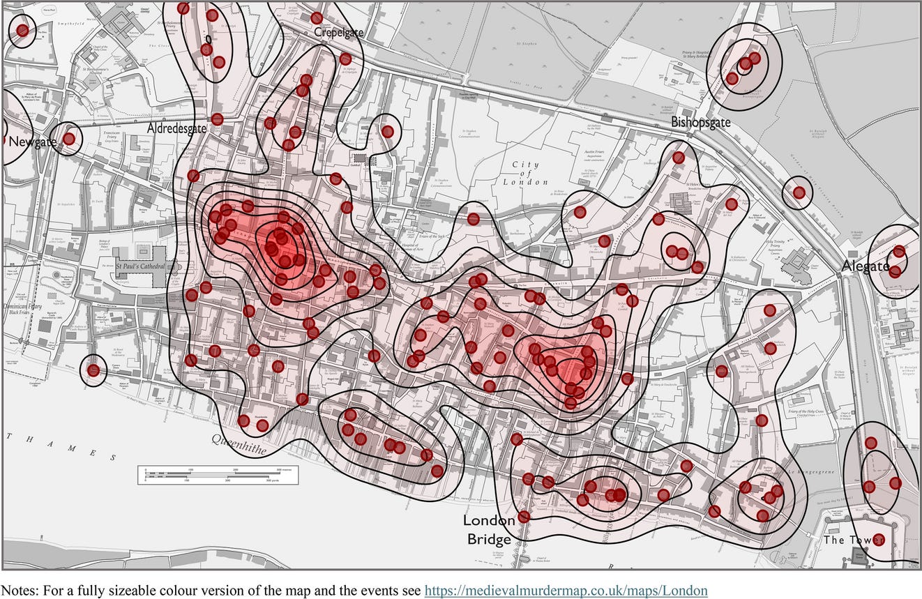 London and York’s estimated rates of homicide were 20-30 per 100,000 inhabitants - on par with contemporary Mexico. By contrast, Oxford’s was 90-100 per 100,000 inhabitants. Though for context, it was only a small town of 6,000 souls, so that worked out as 5 or 6 killings a year.