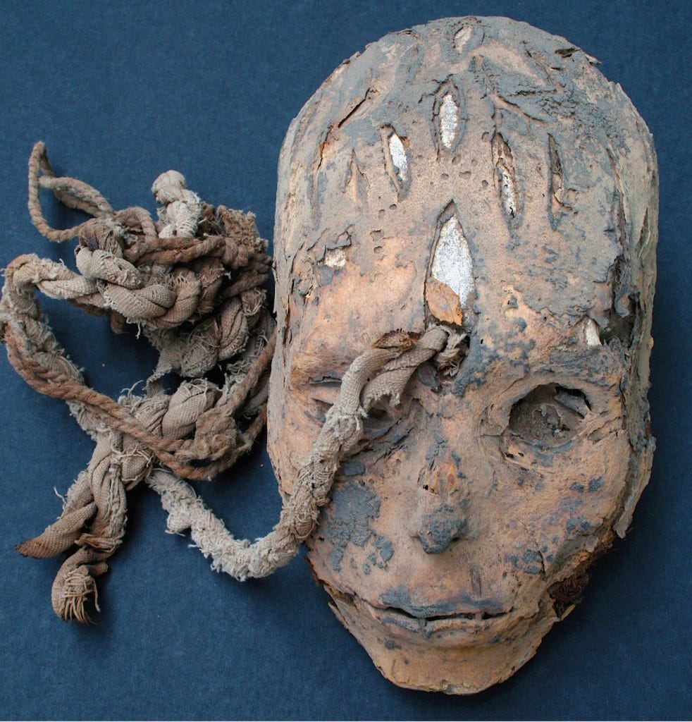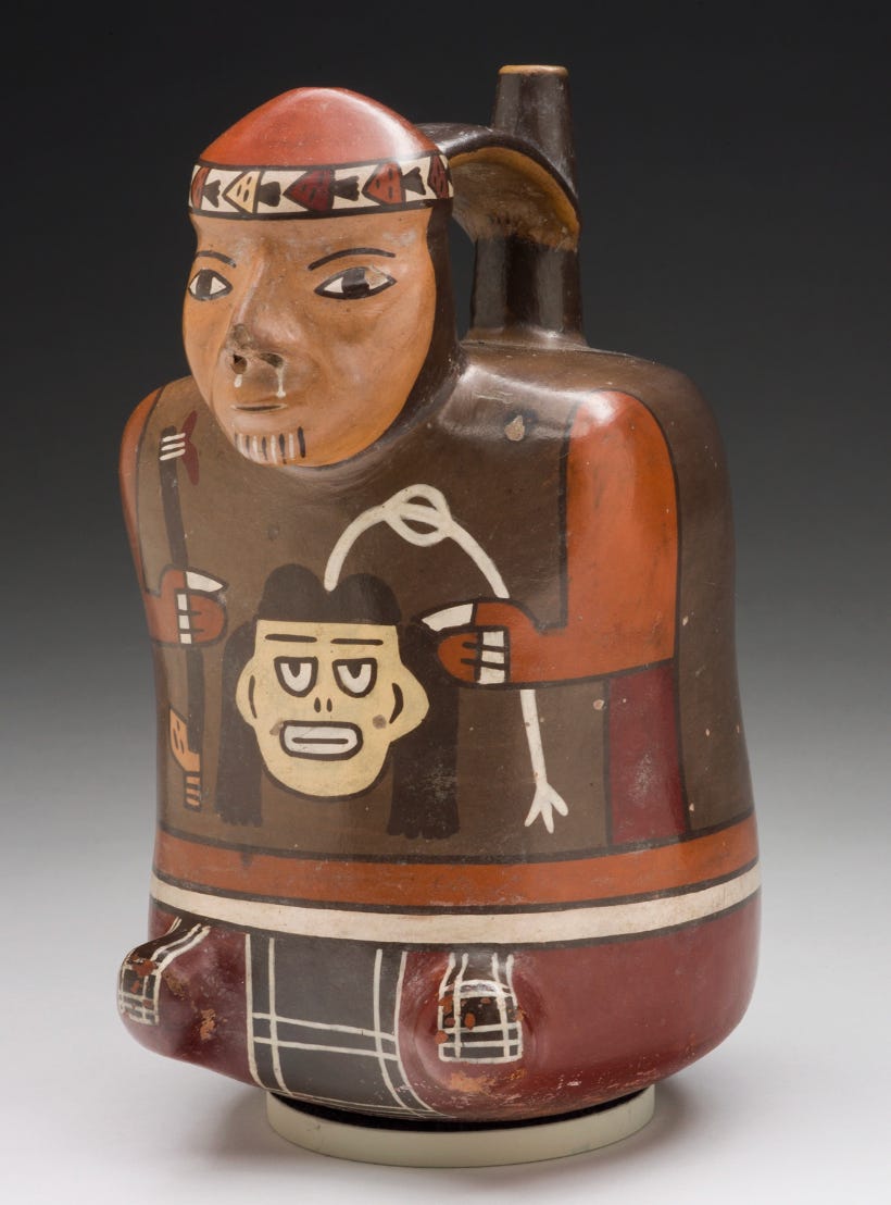The Nasca (of Peru’s south coast) carefully prepared trophy heads by removing brains, drilling holes through fontal bones, applying paint, then carrying them in public processions. Trophy heads sometimes sprouted plants, to convey the link between decapitation and regeneration.