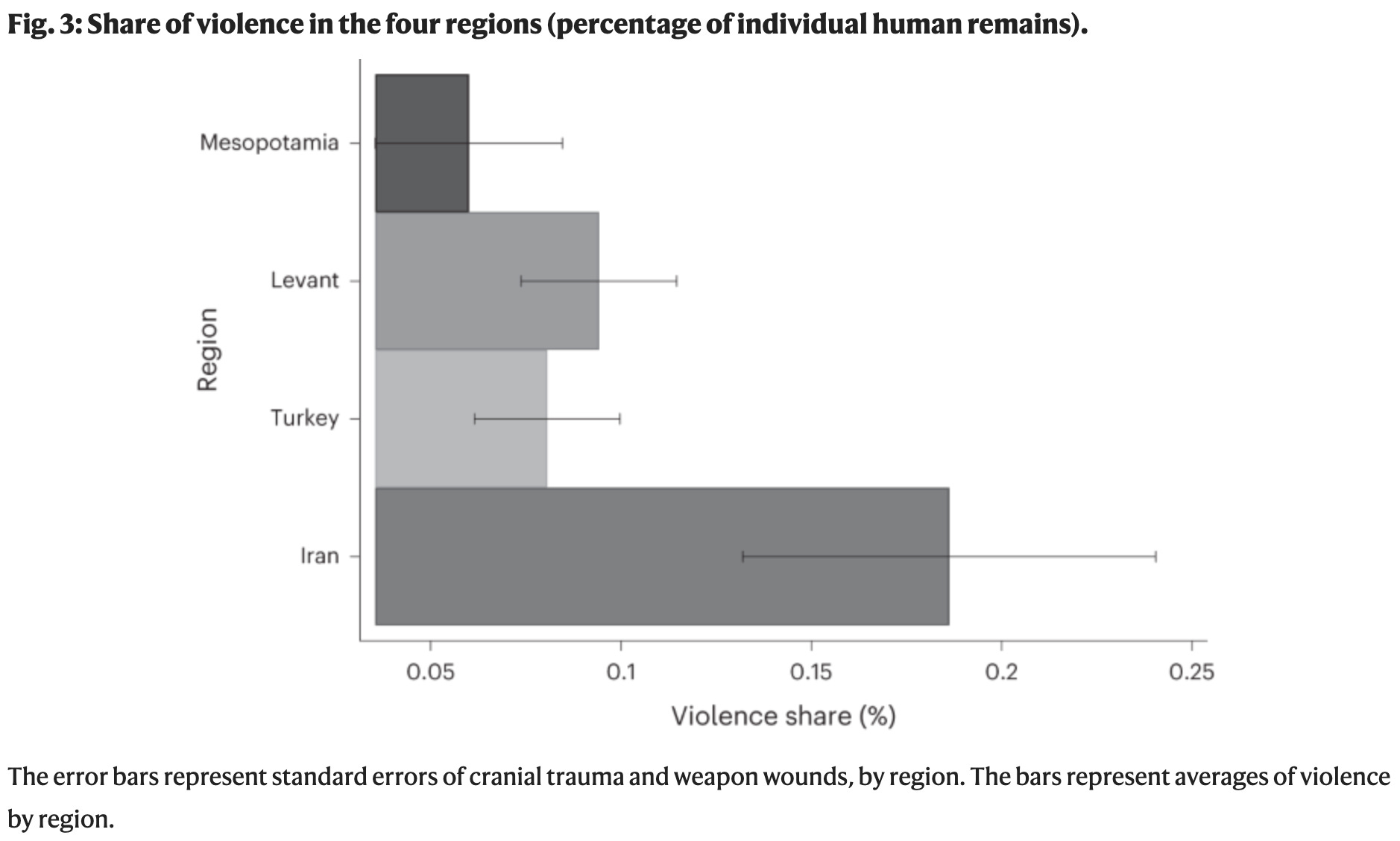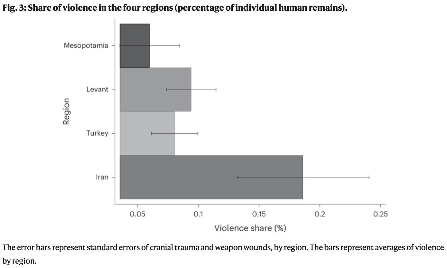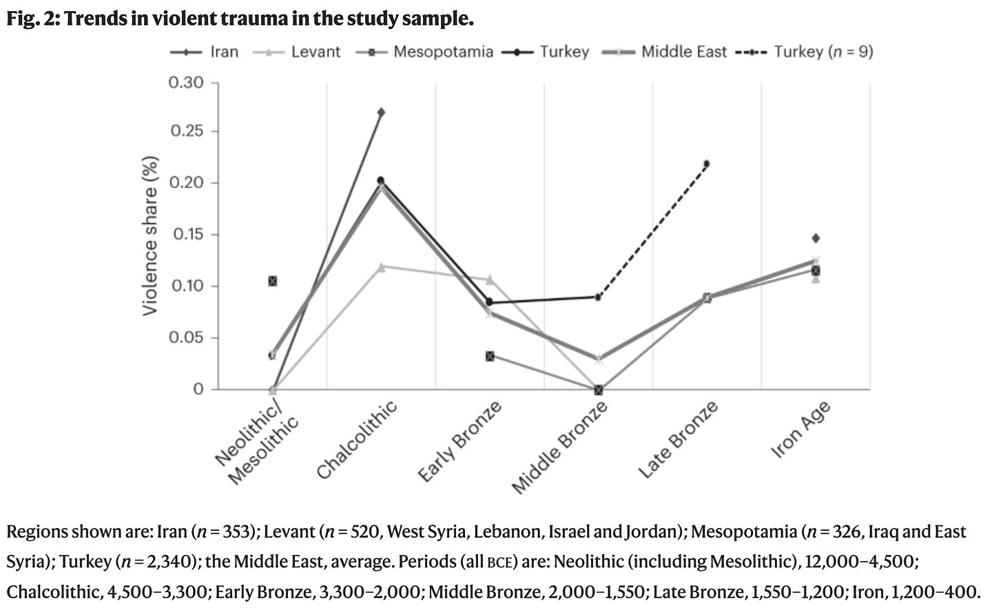 Baten, Benati and Sołtysiak analyse 3,539 individuals from across Turkey, Mesopotamia, the Levant and Iran, from 12,000 to 400 BCE, measuring interpersonal violence using cranial trauma and weapons-related injuries.