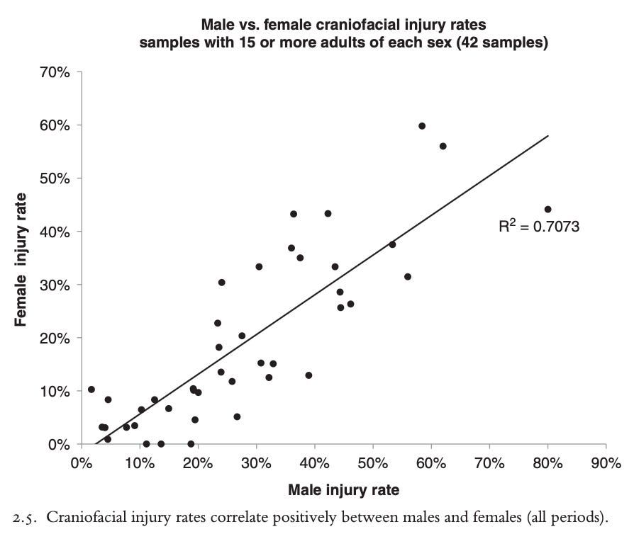 Across large samples, there is a strong positive correlation between male and female trauma. This holds across time and between different societies.