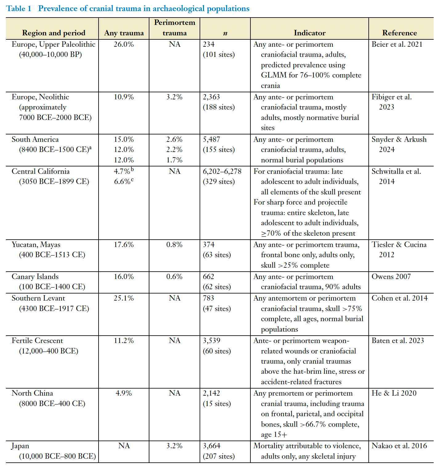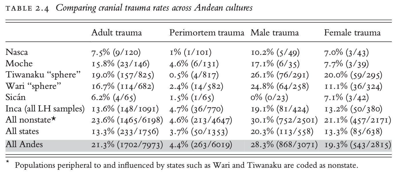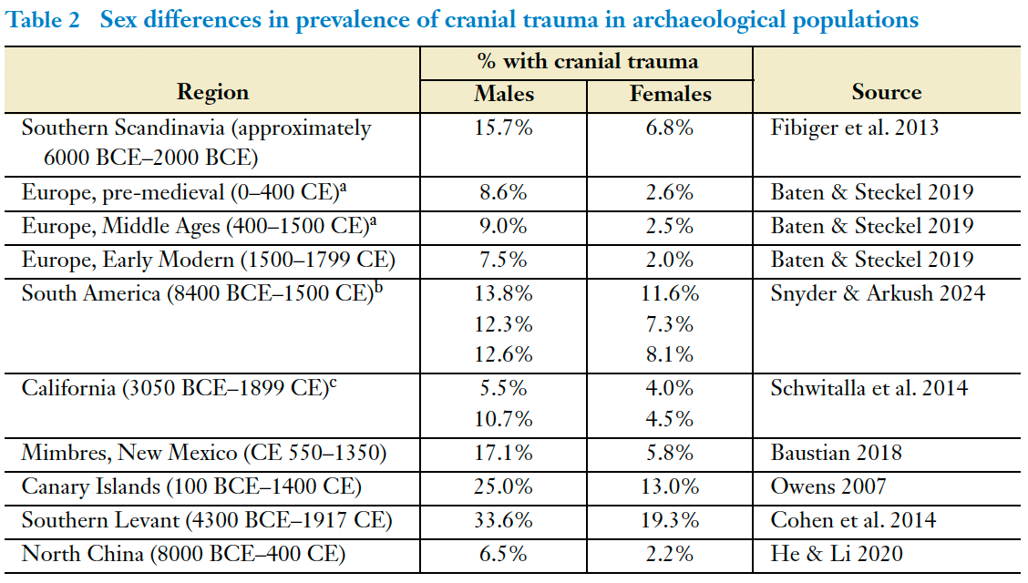 Across Europe, the Andes, the Levant, North China and pre-contact Mesoamerica, roughly 10–25% of adults show evidence of cranial trauma. In Neolithic Europe, 11% of skeletons bear violent head injuries, in the Southern Levant it’s over 25%. In pre-contact South America, rates cluster around 12–15%.