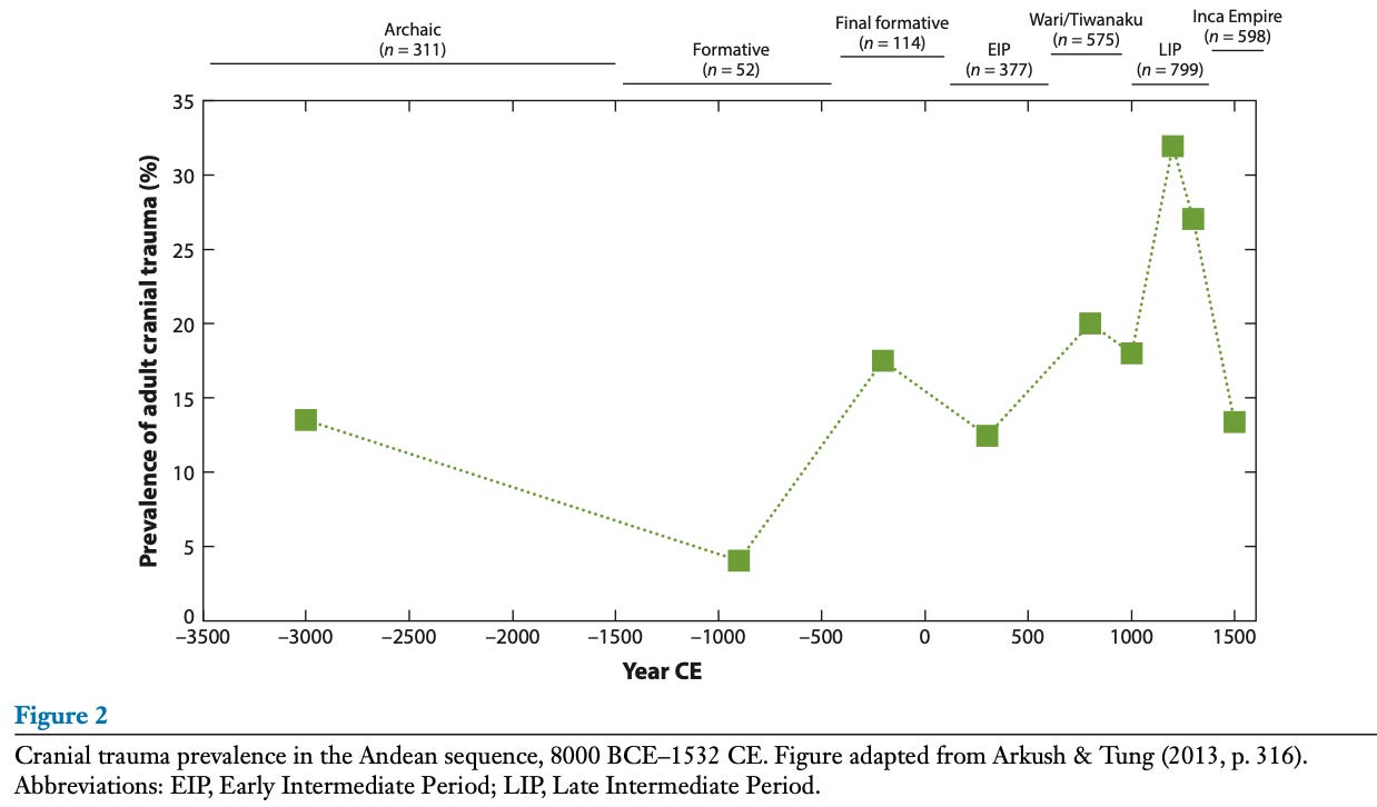 Ancient burials often included skeletons with evidence of trauma - either unhealed lethal blows or healed damage, indicating recurrent warfare. Until recently, studies typically focused on individual sites, making it difficult to discern broader trends, but Eisner and Peng’s fantastic new paper aggregates the evidence across all time periods and regions. (If you’re in the Bay Area and heard a scream of delight, I can only apologise).