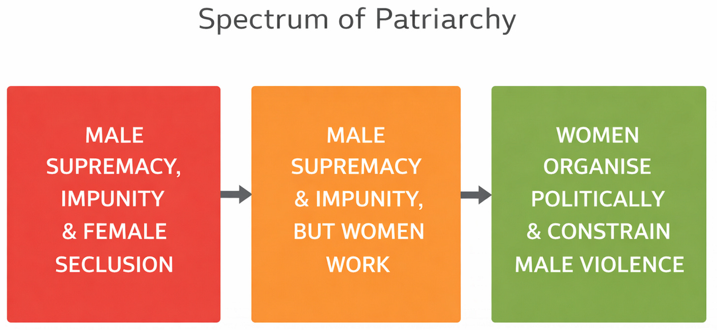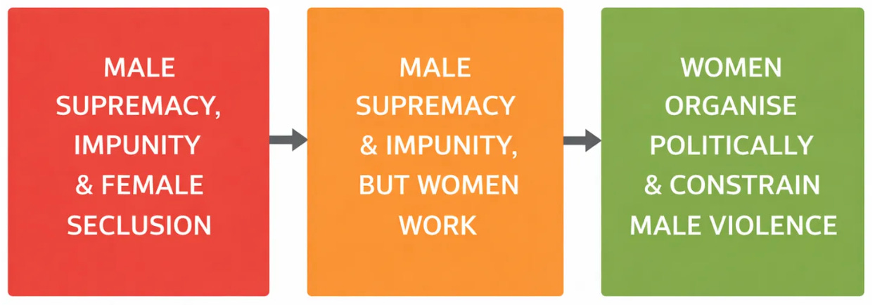 For most of human history, power has been won by militarised coalitions who conquered new territories, raided for slaves, patronised patriarchal religions, while expanding their populations by glorifying maternity. Over the past century, progress has been real, but regionally uneven. In the most patriarchal societies, male status is safeguarded through female seclusion - confining them to the home, preventing any possibility of resistance. In another set, women move freely in markets and public spaces, but men exercise impunity for harassment, assault, trafficking, and gang violence. She is either secluded or vulnerable. Only in a third set have women escaped family control and also walk down the streets feeling safe.