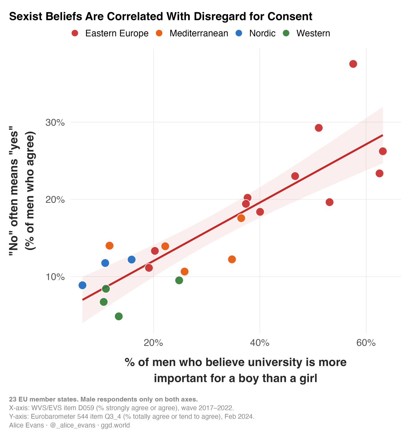 Analysing both World Values Survey and Eurobarometer, I find that countries scoring highly on one dimension of sexism score highly on another. Compared to Western counterparts, Eastern Europeans tend to be more patriarchal. They are more likely to blame victims, dismiss the notion that ‘no means no’, and say that university is more important for boys.