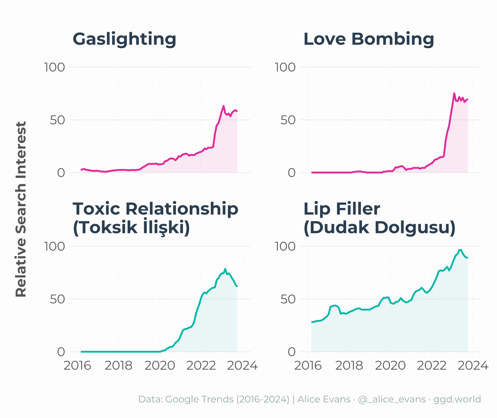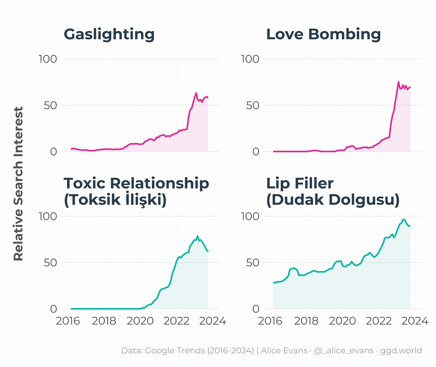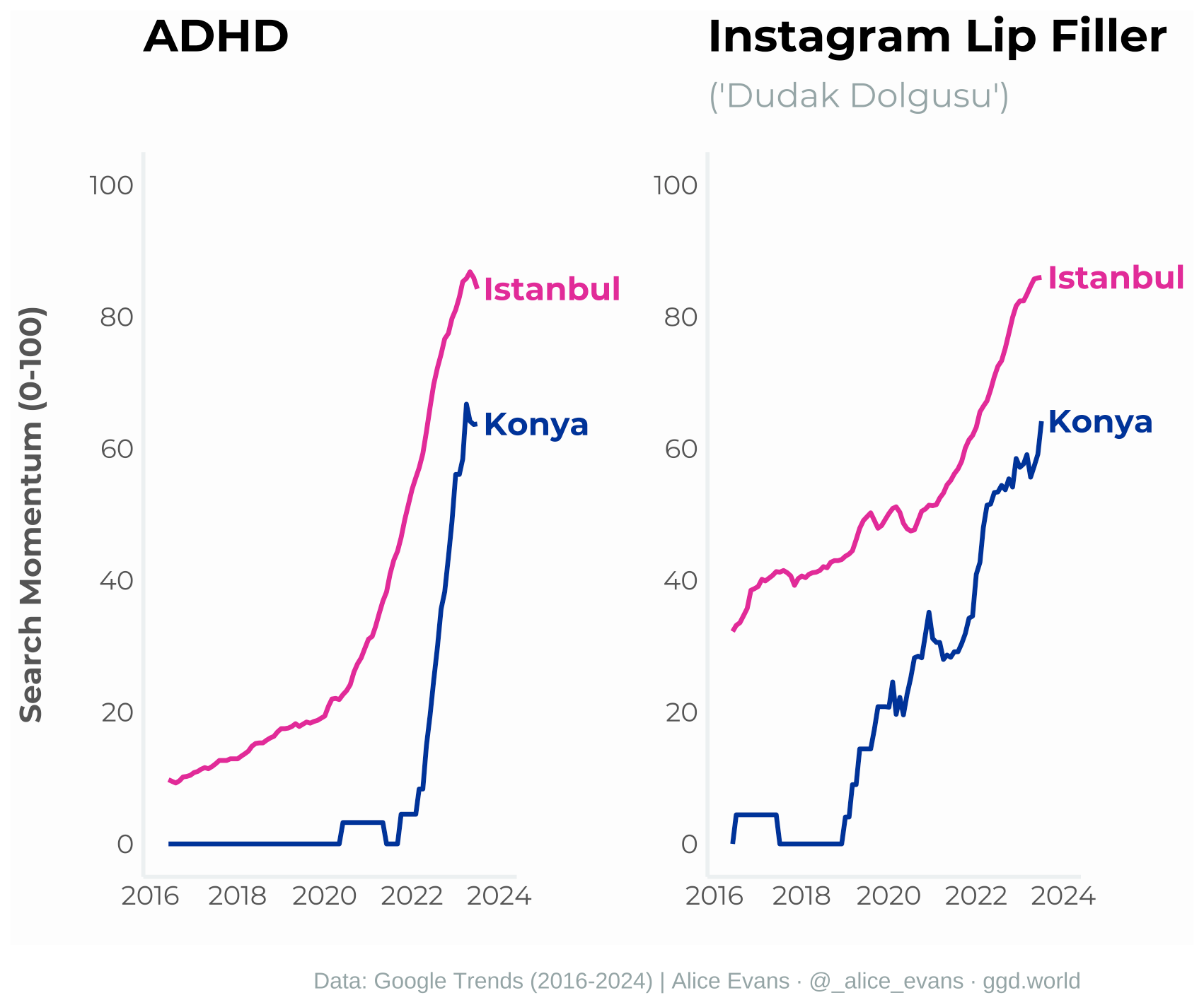 Reflecting growing embrace of US norms, searches for ‘ADHD’ and ‘lip filler’ have spiked - in both Istanbul and Konya. As we spend more time online, our feeds and algorithms, rather than neighbourhoods, play a growing role in shaping cultural expectations. And this is entirely consistent with my qualitative research…