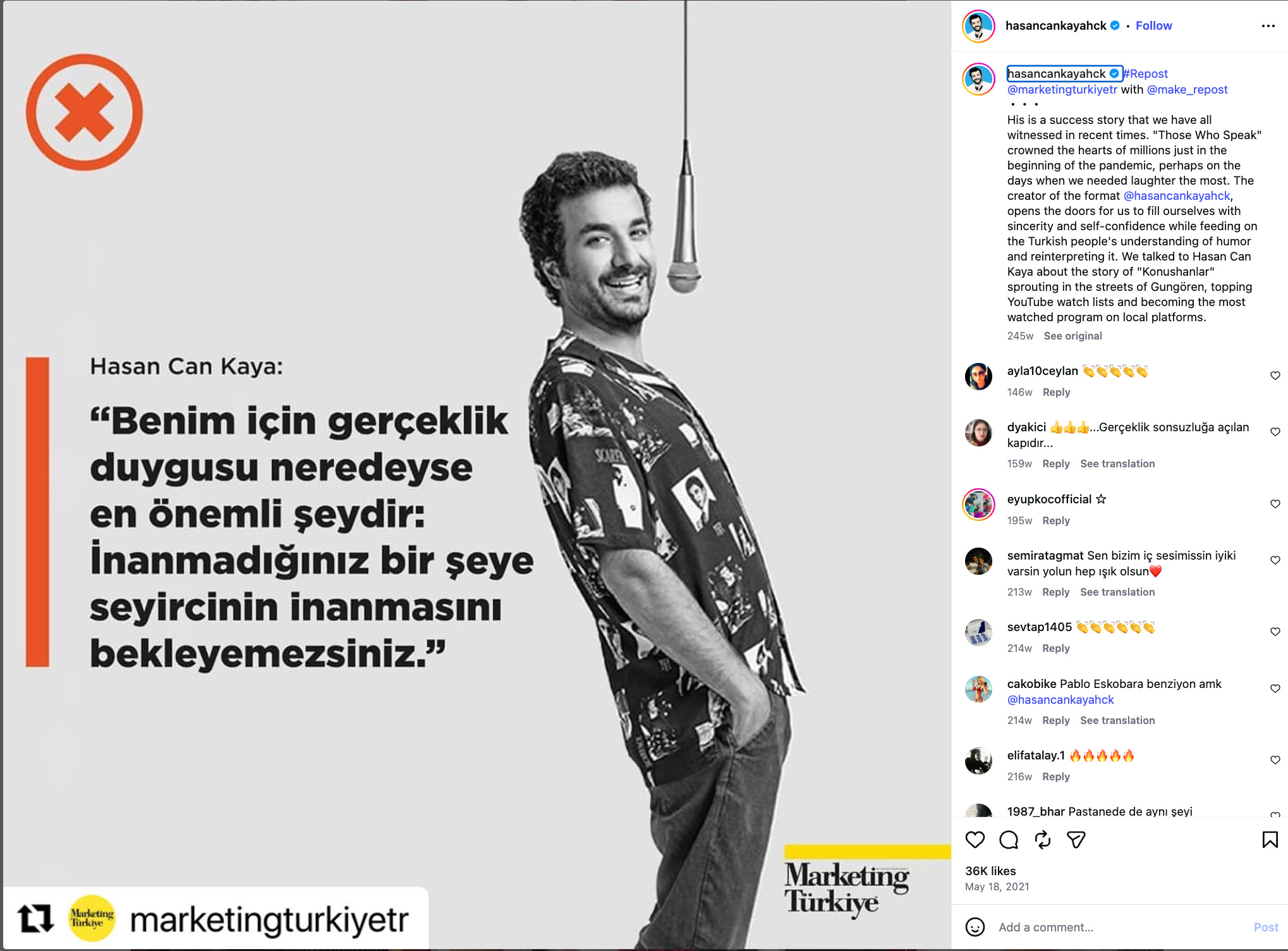 Marshalling this same weapon - irreverent comedy - women have been sharing their own ideas. Yasemin Sakallıoğlu, 37, with over seven million Instagram followers, pokes fun at women’s never-ending drudgery, cooking and cleaning for religious festivals. As a middle-aged mum, she’s extremely relatable - never aggressive or polemical. Much like U.S. women’s magazines in the 1970s, she brings feminist ideas to a mass audience through irreverent, self-effacing humour.
