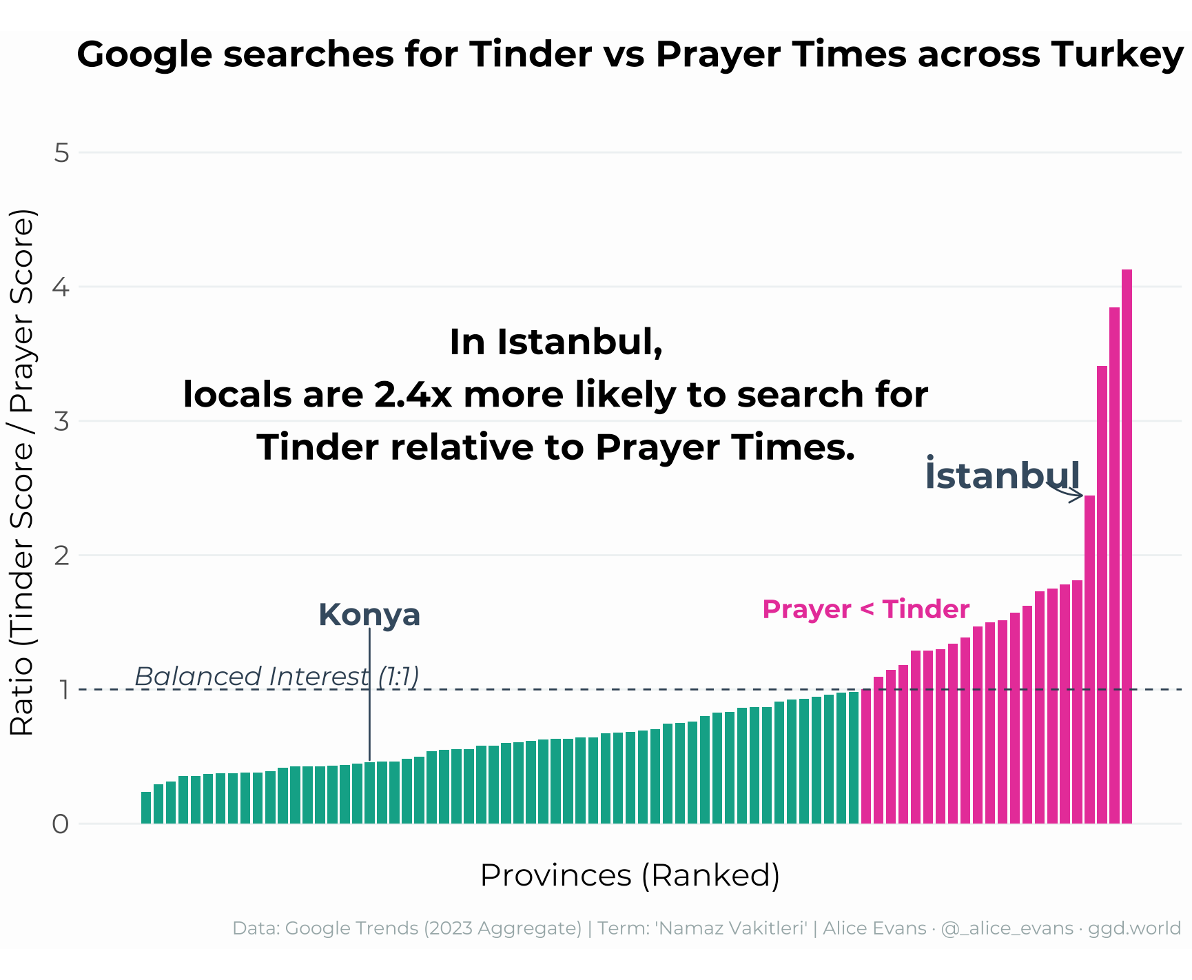 Analysing Google Trends, I can visualise Turkey’s regional heterogeneity. In Istanbul, locals are 2.4 times more likely to search for ‘Tinder’ relative to ‘prayer times’ (namaz vakitleri).
