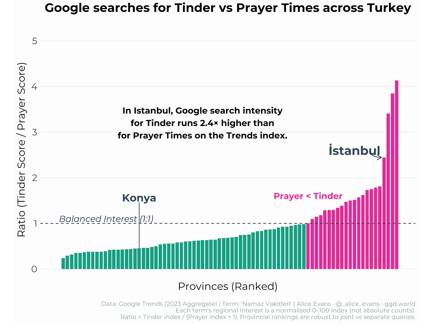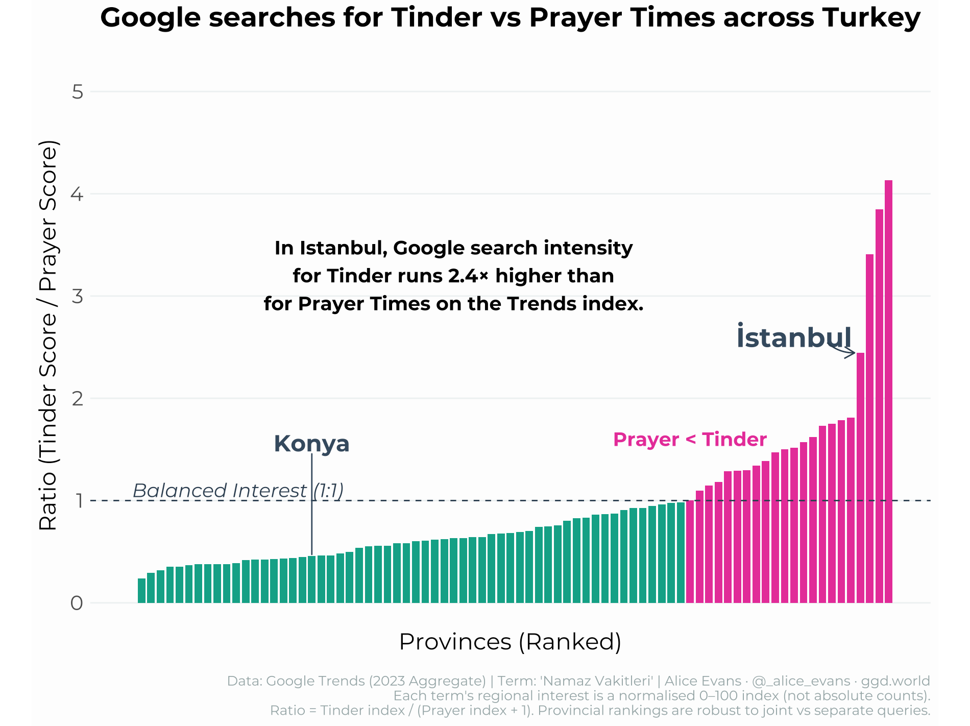 Below, each province’s bar shows the ratio of its Google Trends search index for Tinder relative to its index for Prayer Times (’Namaz Vakitleri’), with both terms independently scored by Google based on search concentration rather than raw volume. For more details see footnotes.