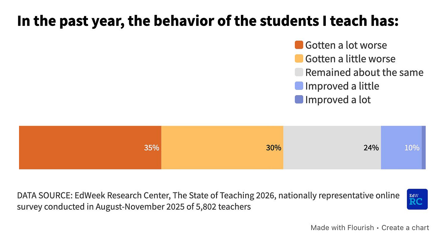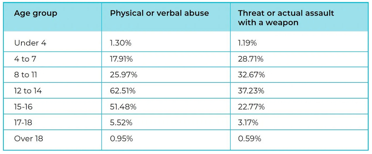 Over in Britain, 24% of surveyed teachers say they’ve been pushed or shoved in the past year, while 62% report recent verbal abuse. 1 in 7 British secondary school teachers say they are attacked by pupils at least once a month. In 2023/24, there were a million suspensions at state schools. Teachers at two primary schools in Greater Manchester recently went on strike against ‘almost daily’ pupil attacks: biting, kicking, ripping skin off hands, throwing chairs through windows, and bringing knives. Allegedly, one was “locked in the room by students so I’ve not been able to get out”. Scotland’s largest teaching union reports that a quarter of its members in Aberdeen were physically assaulted last year, while a third see violence every single day.