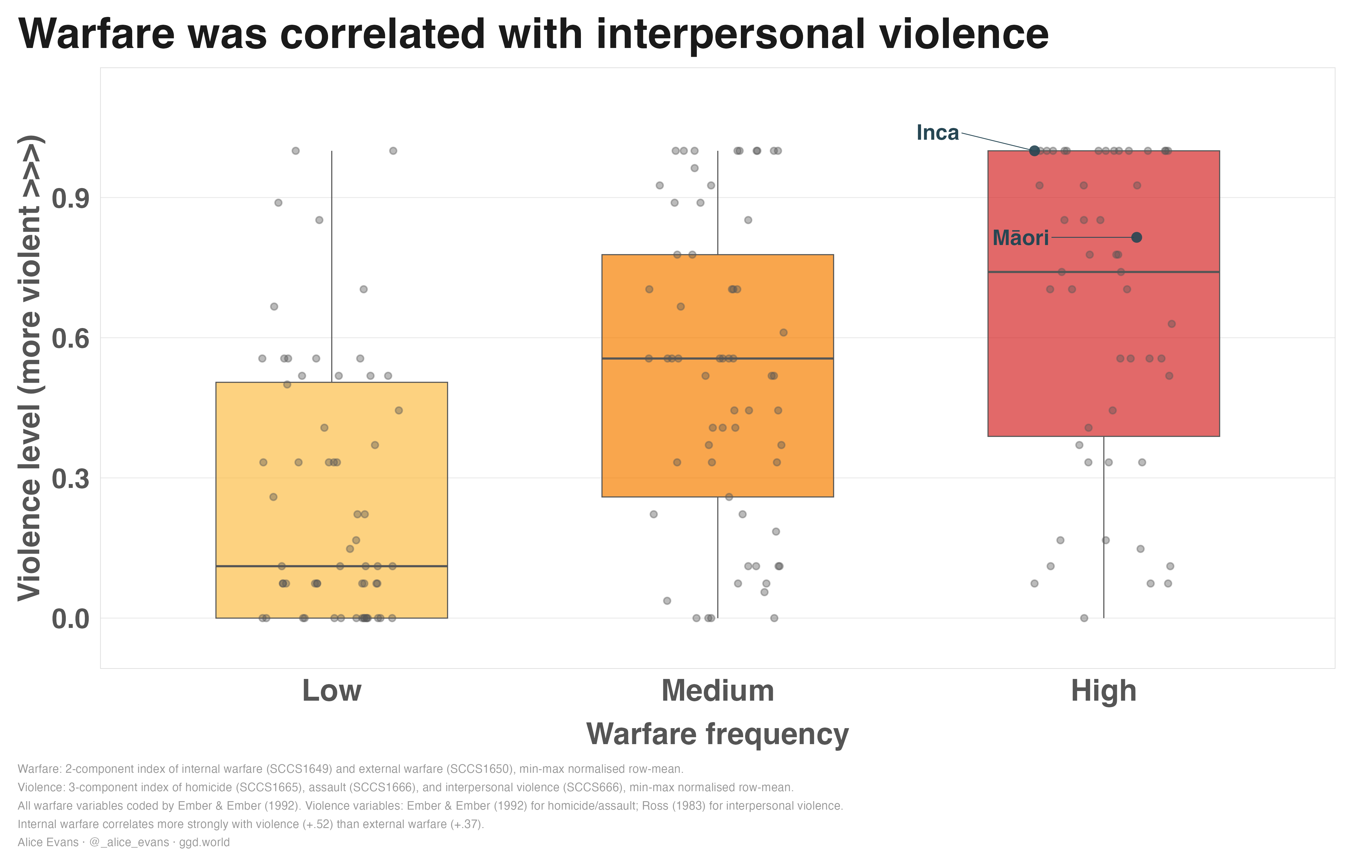 Not all pre-industrial societies were violent or warlike. But societies that frequently waged war also tended to exhibit more interpersonal violence - more assaults, coercion and homicides.