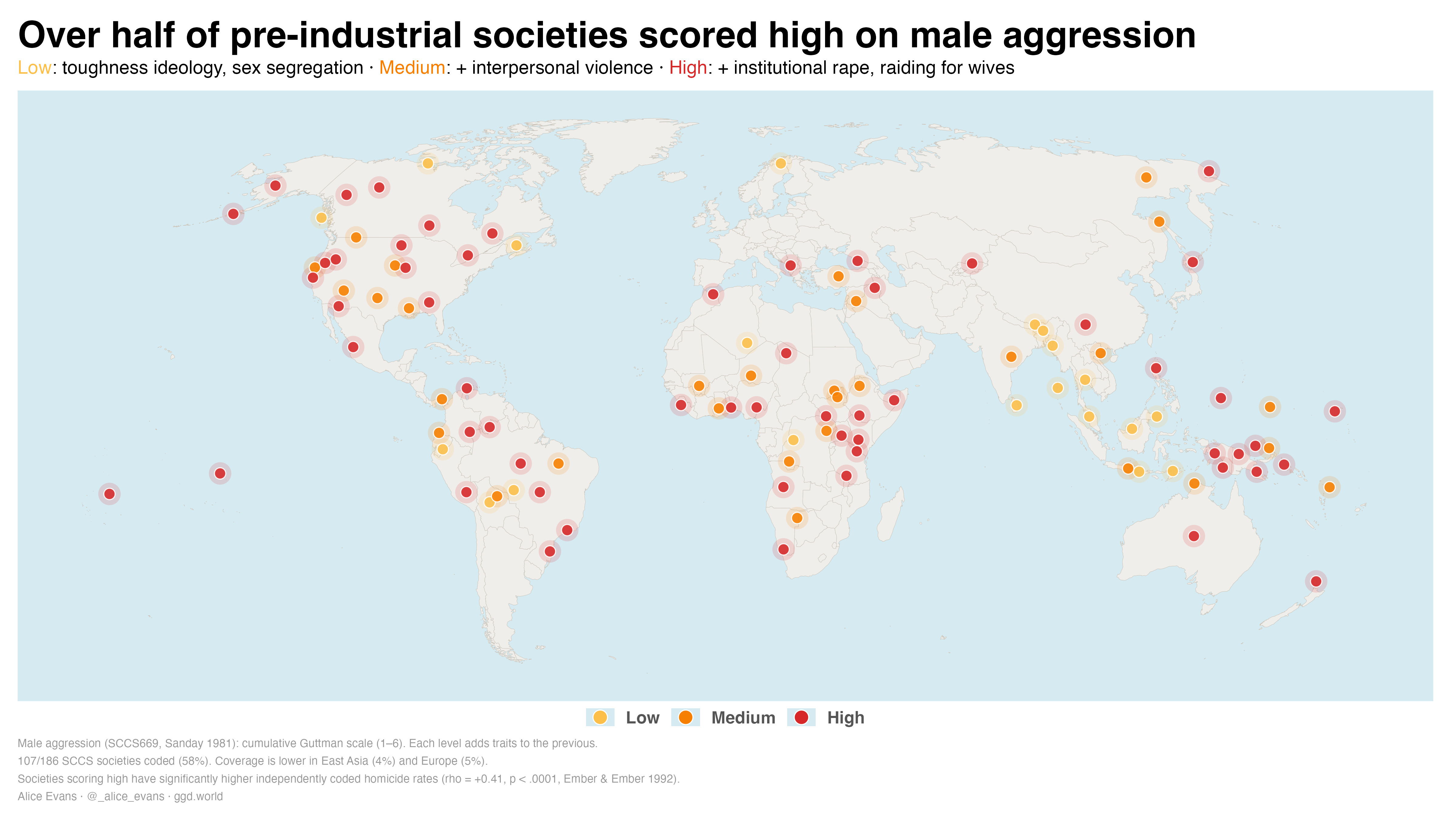 Male aggression is coded on a cumulative Guttman scale, with the highest score assigned to societies that institutionalised rape and raided for wives. Over half of pre-industrial societies in the SCCS reach this maximum level.