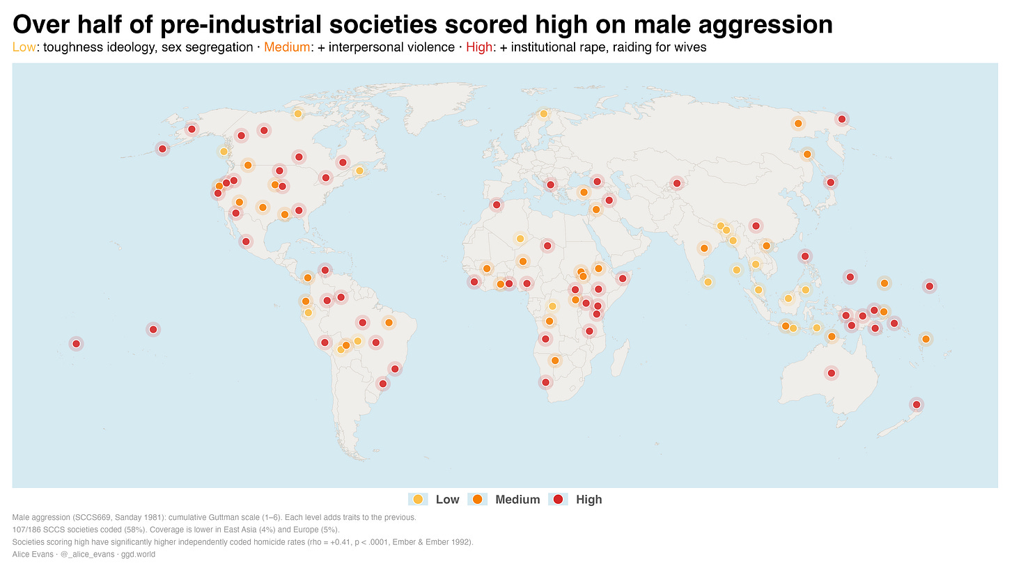 3) Over half of pre-industrial societies score highly on male aggression