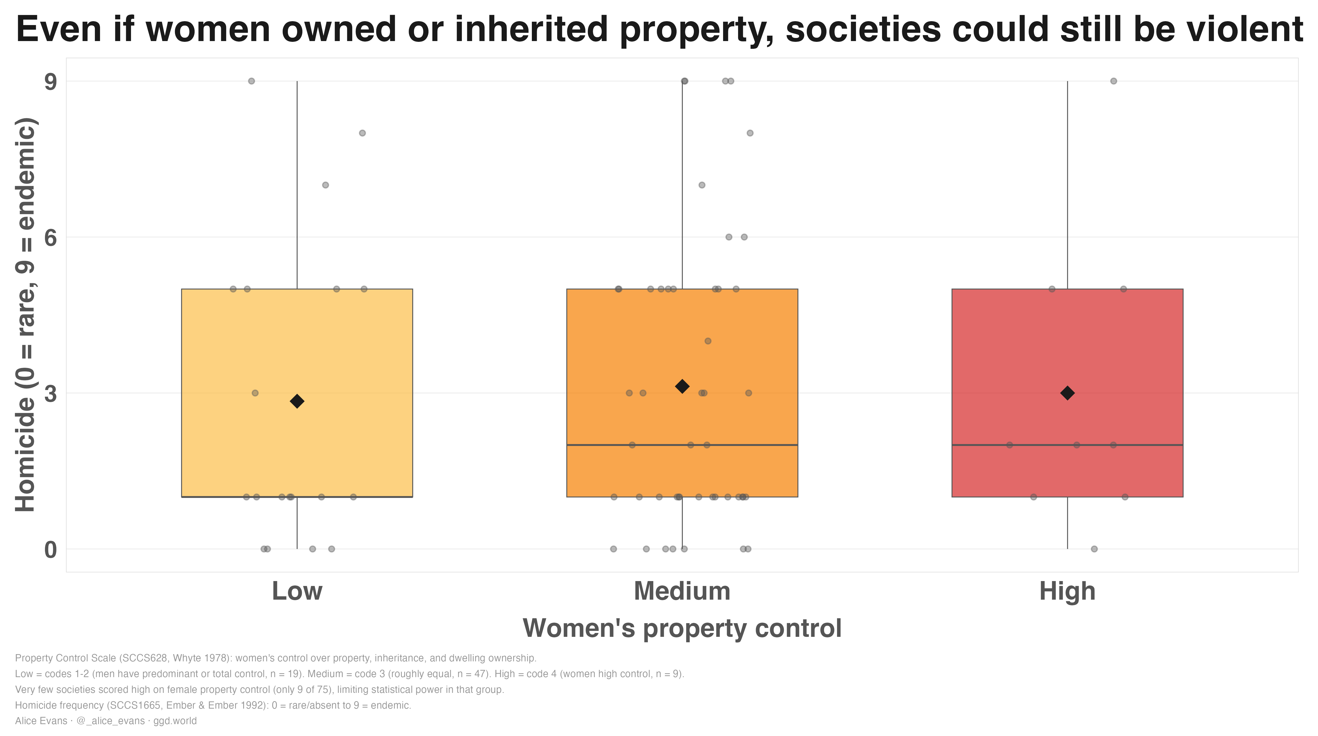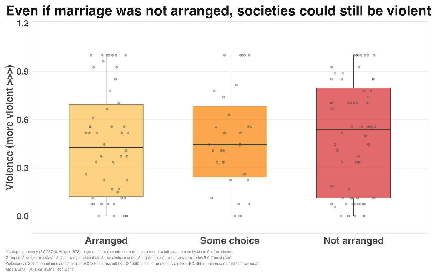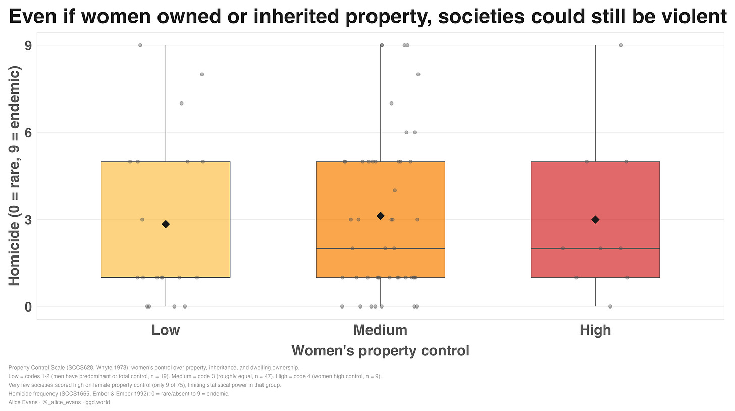 I also plot female property ownership against violence. As you see, there is no relationship. Even if women lived near their natal kin, owned property, or were free from arranged marriage, they might still be vulnerable to male predation.