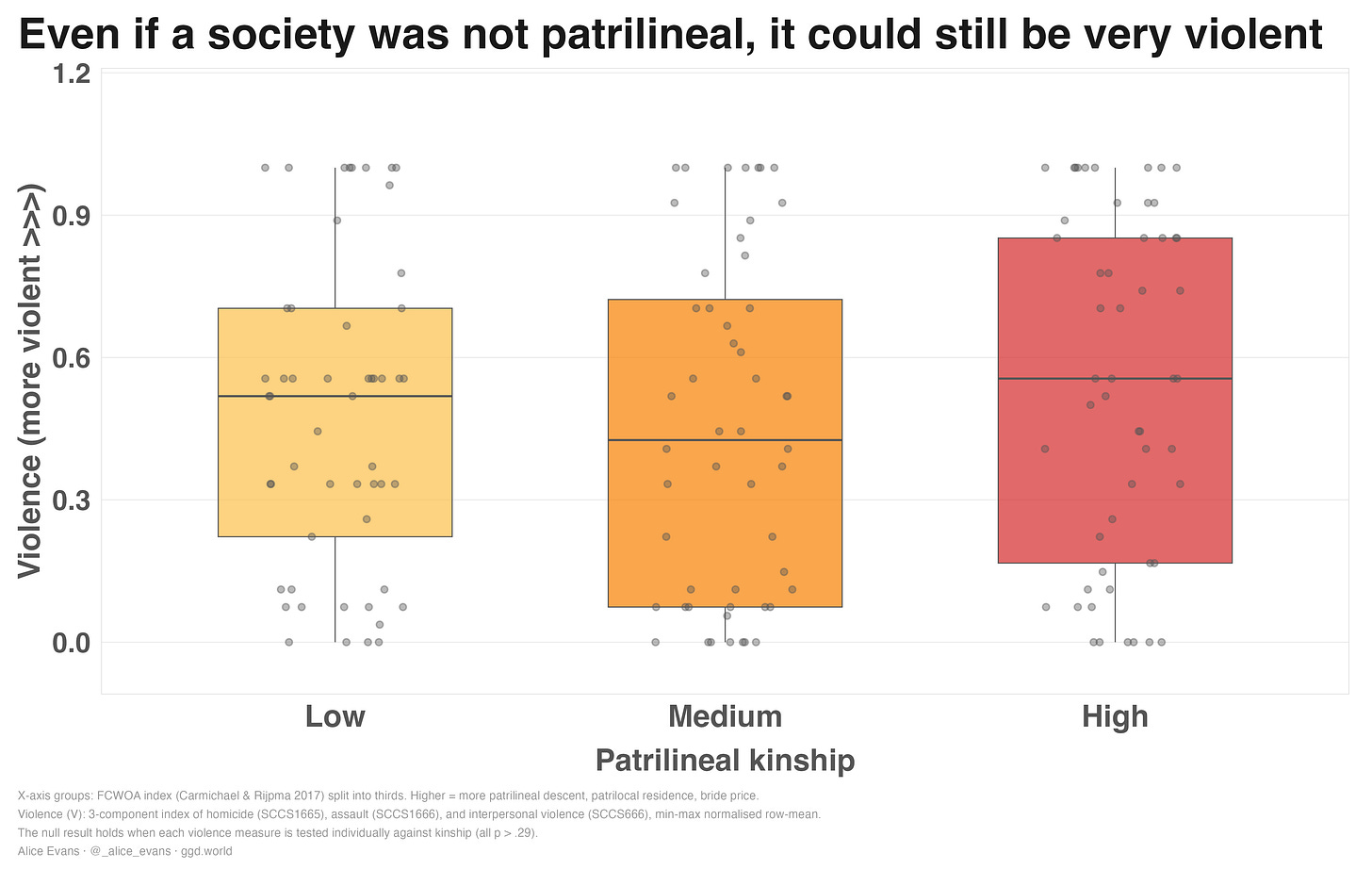 The graph below plots the Carmichael–Rijpma ‘Family Constraints on Women’s Agency’ index against violence. Two components account for most of the variation: patrilineal descent and patrilocal residence.