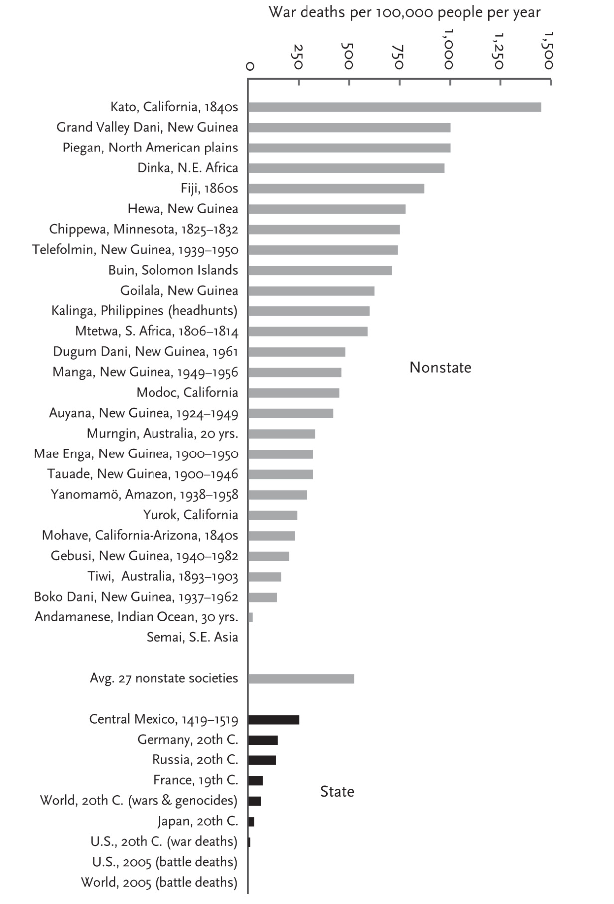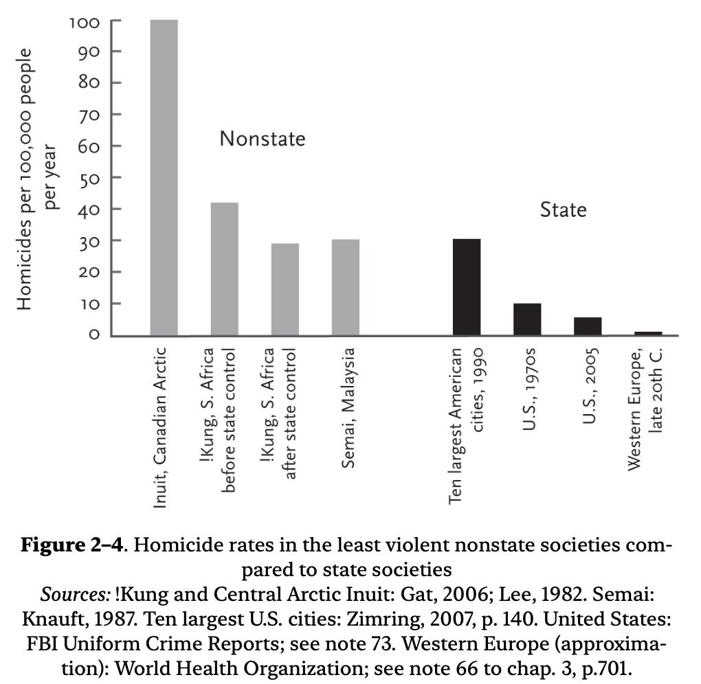 In “Better Angels of Our Nature”, Stephen Pinker suggests that small-scale societies had extremely high rates of war deaths and homicides.