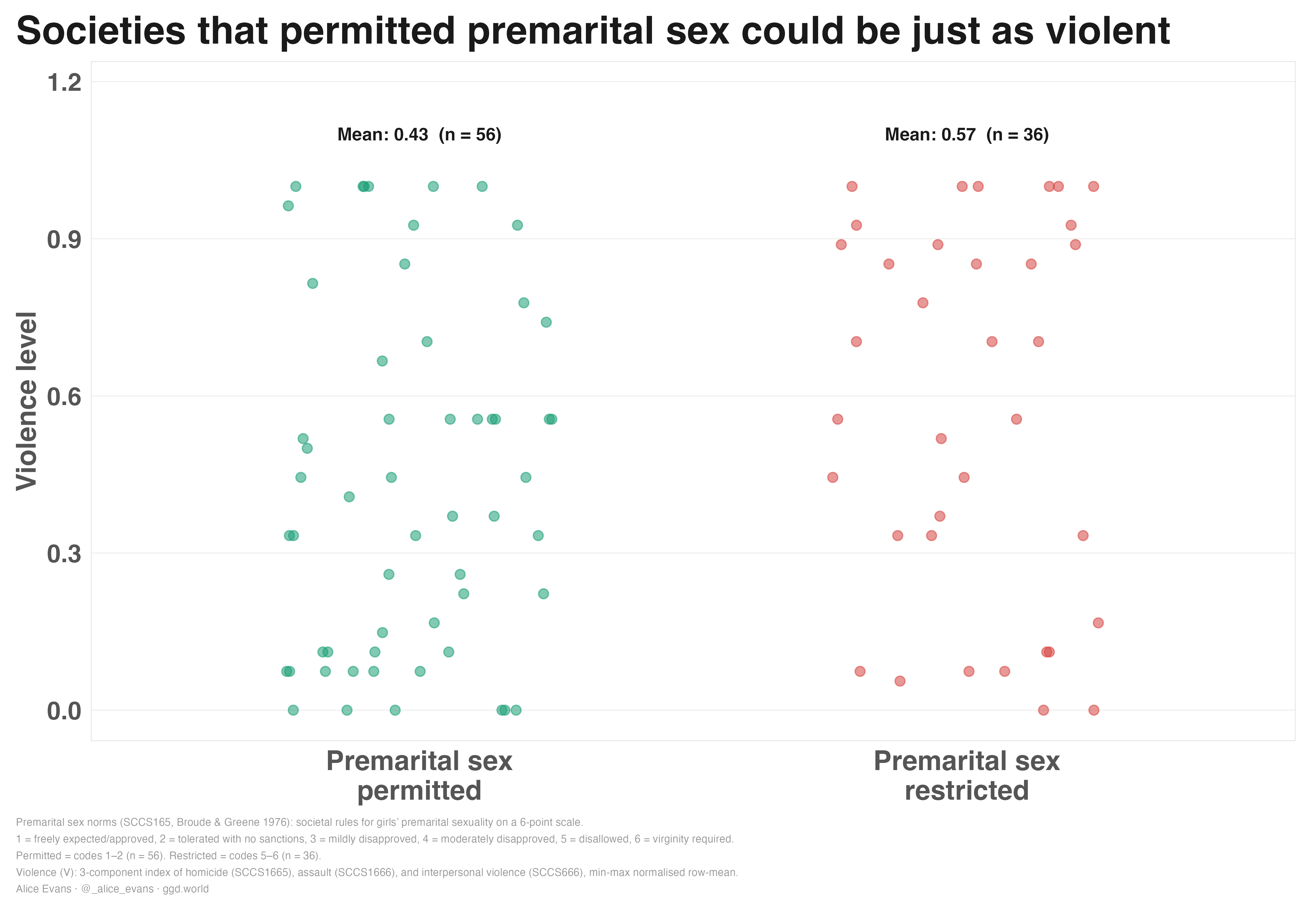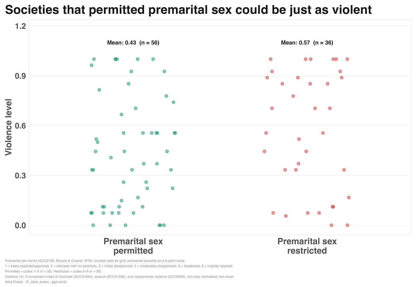 I do find a correlation between restrictive premarital sex norms and homicide, but this relationship is driven by 21 societies that are both extremely restrictive and extremely violent. If these cases are removed, the correlation disappears. Looking more closely, this cluster of societies tend to be pastoral economies with organised violence, waging wars for resources, and socialising boys to be aggressive. Otherwise, there is no relationship between pre-marital sex norms and violence.