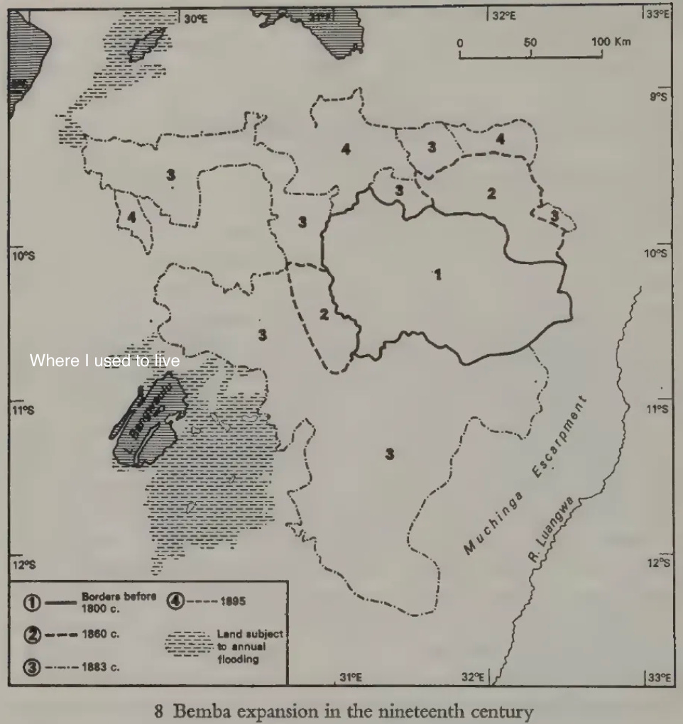 In the 19th century, this co-existed with warfare: Bemba chiefs expanded their territory by raiding neighbouring groups and taking captives. In 1832, Gamitto reported that ‘the Bemba.. are today powerful and feared by all for their fierceness’. In 1895, [Chief] ‘Ponde’s men captured Chitimbwa’s village, killed the chief and carried away rich spoils of cloth, salt and women’.