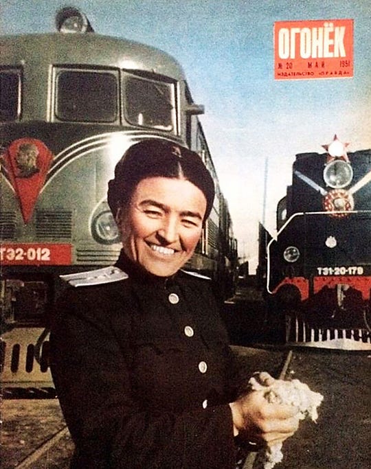 Female pioneers were celebrated - in novels, magazines and Soviet ceremonies. Basharat Mirbabayeva - Uzbekistan’s first female train driver and parachutist - was front page news. This was a ‘real revolution in life, in customs, in the minds of people’ - wrote Jabbarli in 1931.