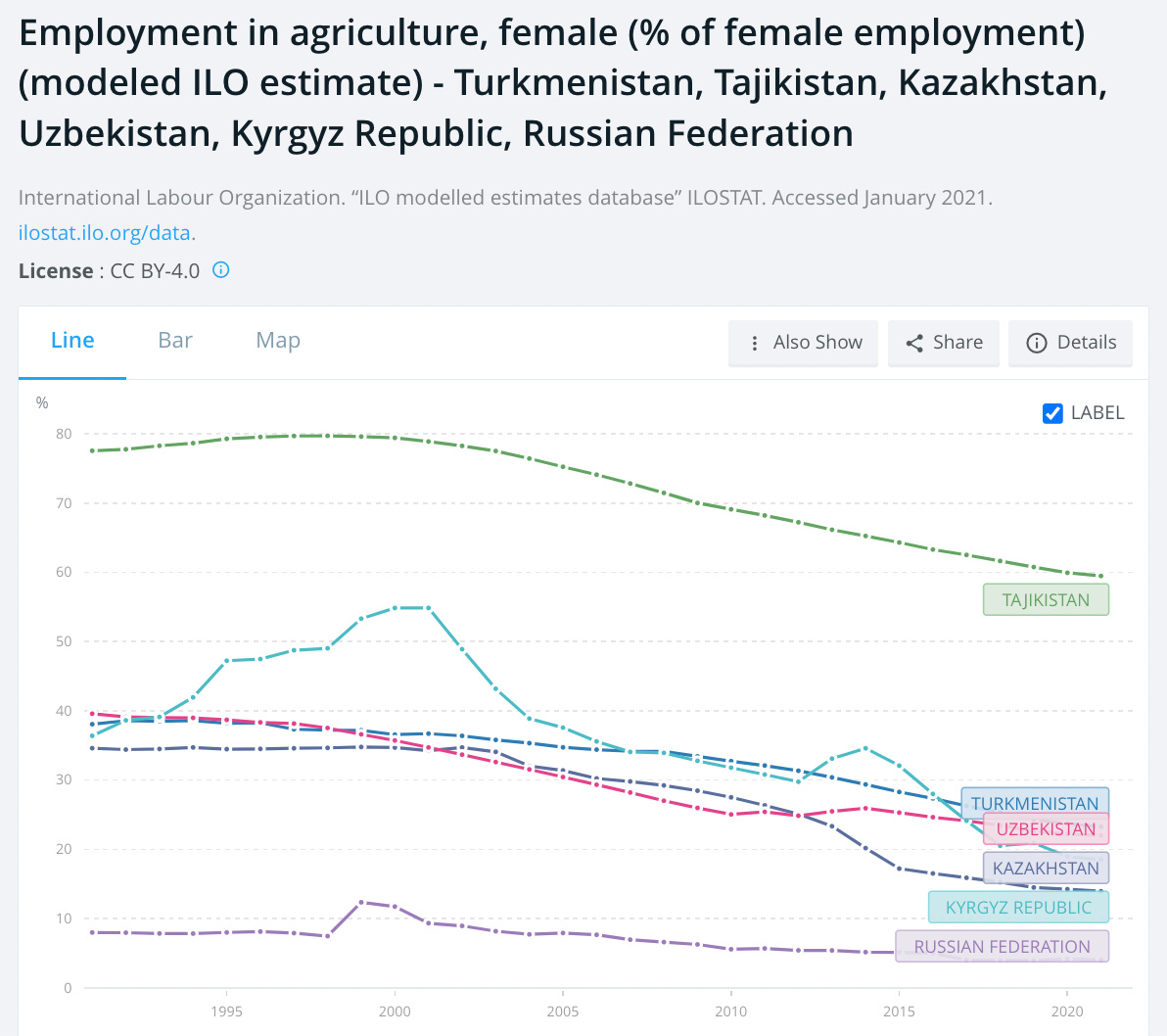 In 1990, less than half of Uzbek women worked, of which 40% were in agriculture.
