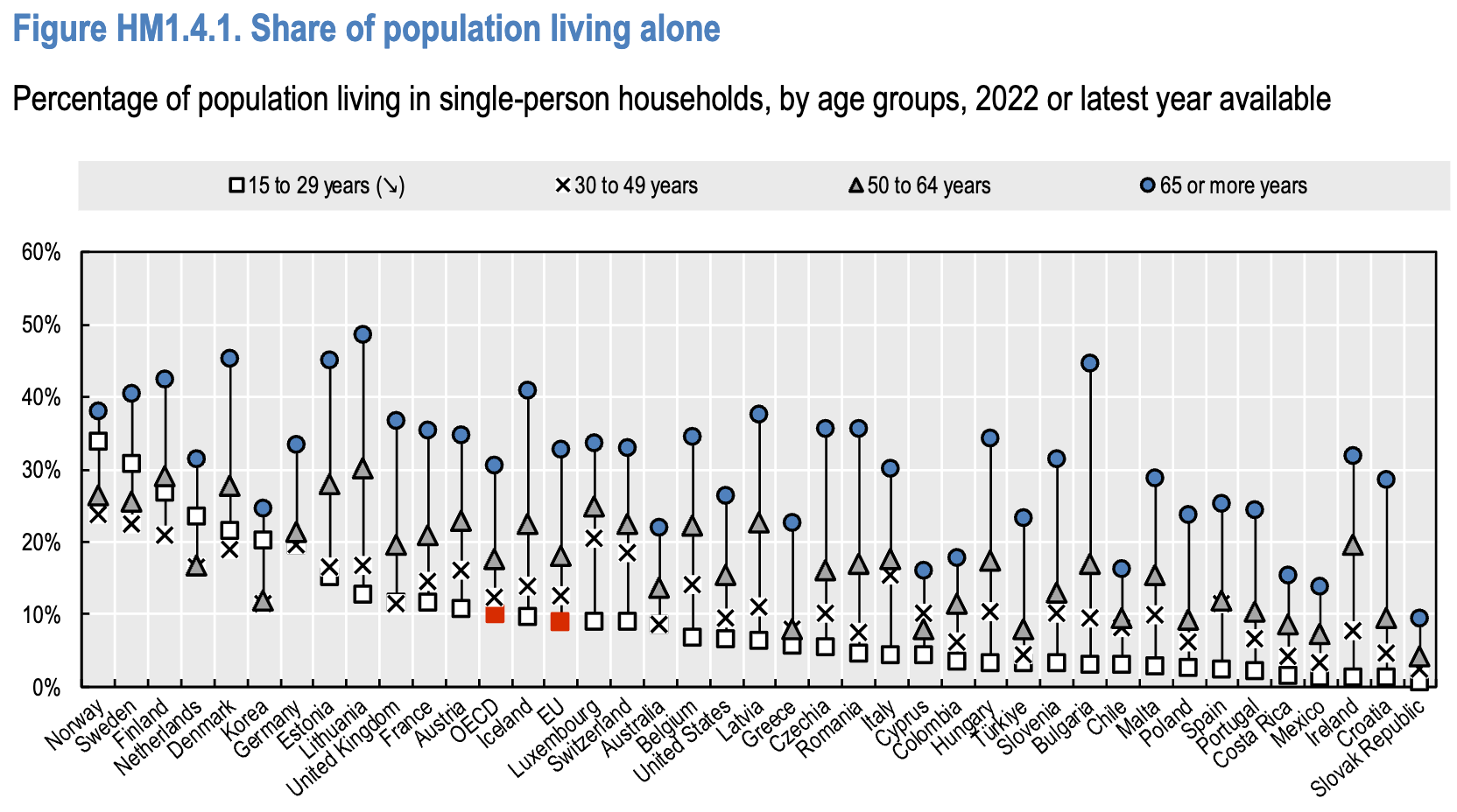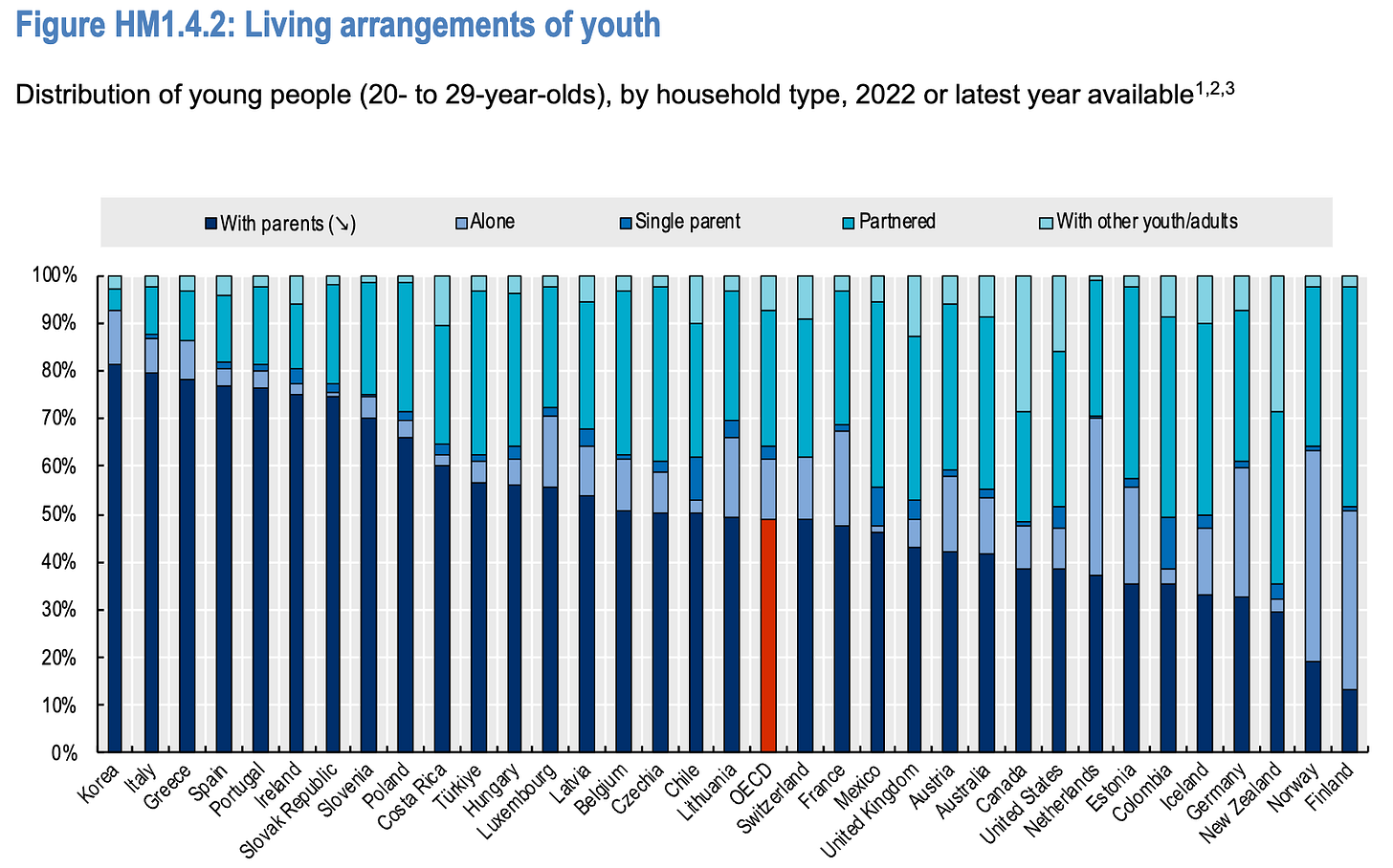 Scandinavia leads the pack - with the highest share of people living alone. This reflects a strong culture and political economy of state-enabled independence. Meanwhile in societies with stronger kinship - like Korea, Greece, Spain and Italy - young people also tend to be single, but live with their parents.