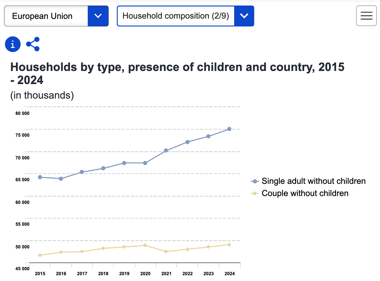 In the EU, 20% of men (aged between 25 and 54) live alone. The big shift is not childless couples, but the rise of singles. Single adult households have shot up by 17% between 2015 and 2024, compared to 5.8% for all households.