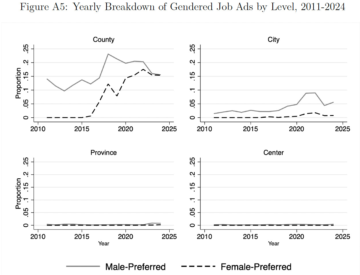 From 2005 to 2015, the share of job adverts explicitly preferring male candidates grew from 0.05% to 15%, with virtually no postings preferring women. From 2016 to 2024, adverts increasingly preferred male candidates, reaching a high of 30%. There were also some adverts for women, but these were usually paired “split-gender” postings, for otherwise identical jobs.