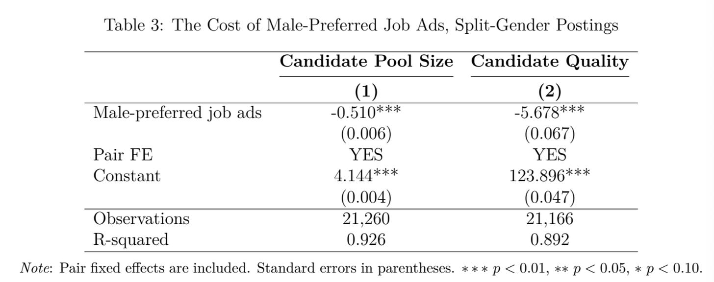 A rise in male-preferred job adverts is associated with 40-45% smaller candidate pools, and with 4-5% lower exam cut-offs.