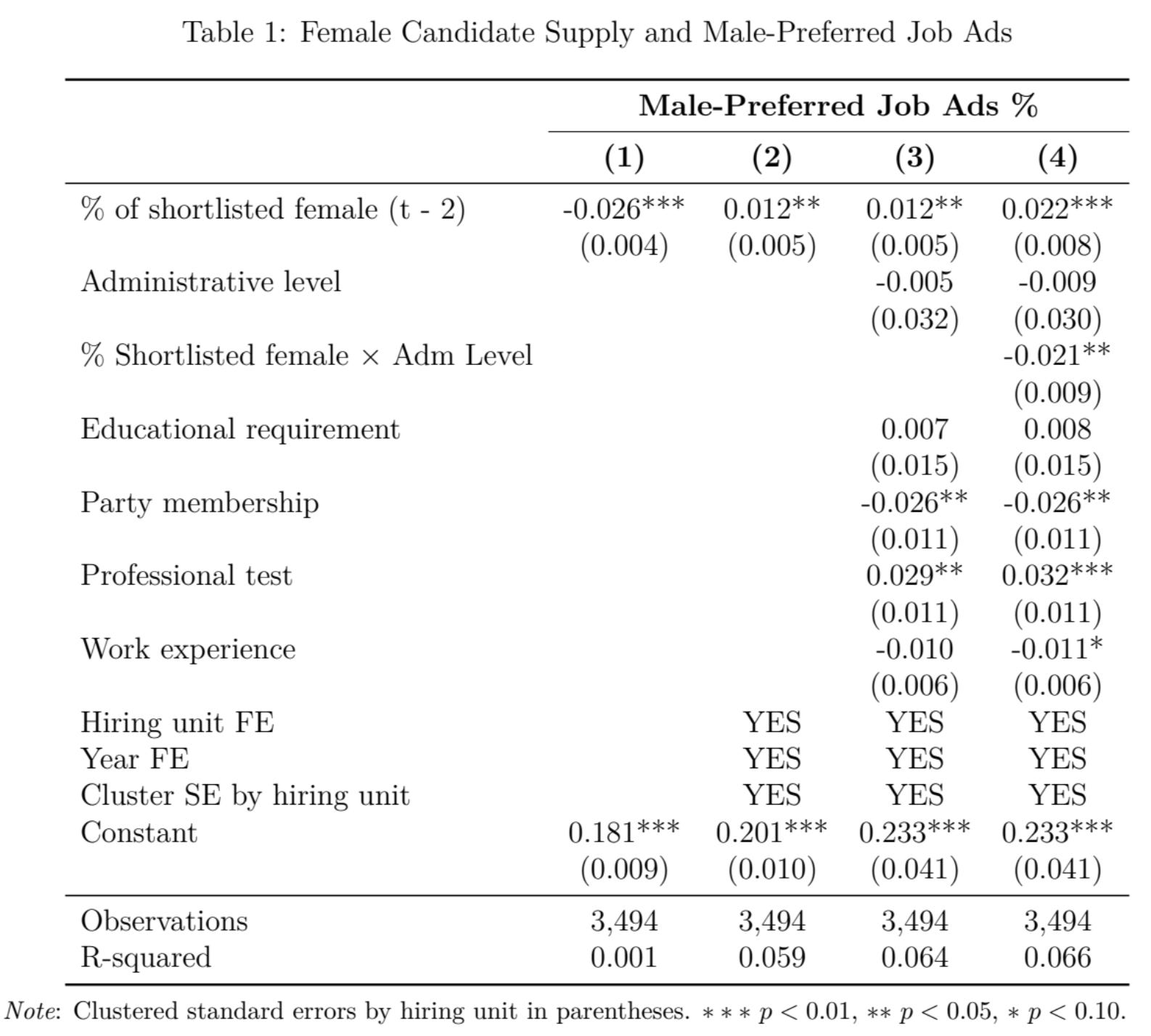 Huang finds that as women’s share of shortlisted candidates rose, hiring units subsequently issued more adverts for men. Importantly, this pattern does not appear in the pooled cross-sectional comparison. It only emerges once Huang compares each hiring unit to itself over time, using hiring-unit and year fixed effects.